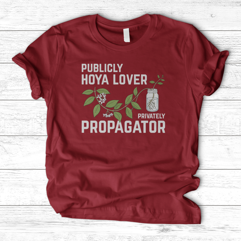 Publicly Hoya Lover Privately Propagator T-Shirt For the discerning plant enthusiast who understands the quiet satisfaction of cultivating rare specimens, this tee strikes the perfect balance between public passion and private pursuit. Crafted from premium cotton, it features a refined design that speaks to both the casual admirer and the dedicated propagator. Whether you're sharing your horticultural interests or simply expressing your refined taste in botanical humor, this shirt becomes a subtle declaration of your commitment to the art of plant propagation. An ideal choice for those who appreciate quality apparel that reflects their sophisticated approach to plant collecting.